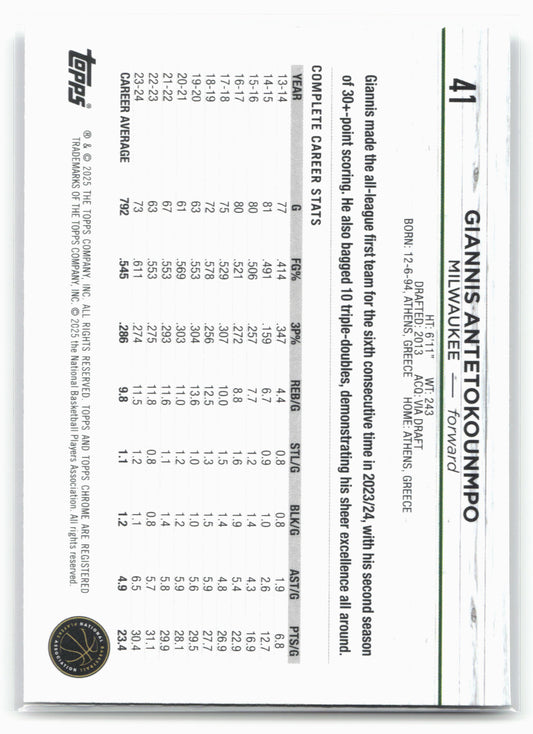 This is a nice example of a 2024-25 Topps Chrome #41 Giannis Antetokounmpo Other important information about this card:In 2024 Giannis Antetokounmpo played for the Milwaukee Bucks.Please check out our...