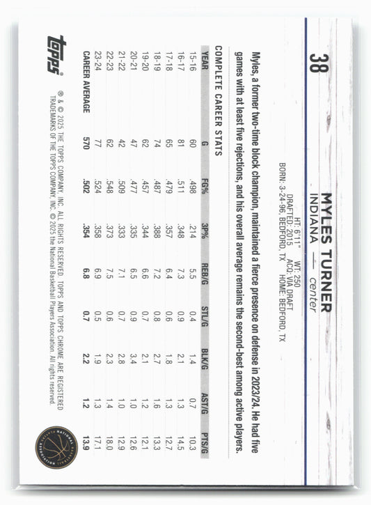 This is a nice example of a 2024-25 Topps Chrome #38 Myles Turner Other important information about this card:In 2024 Myles Turner played for the Indiana Pacers.Please check out our...