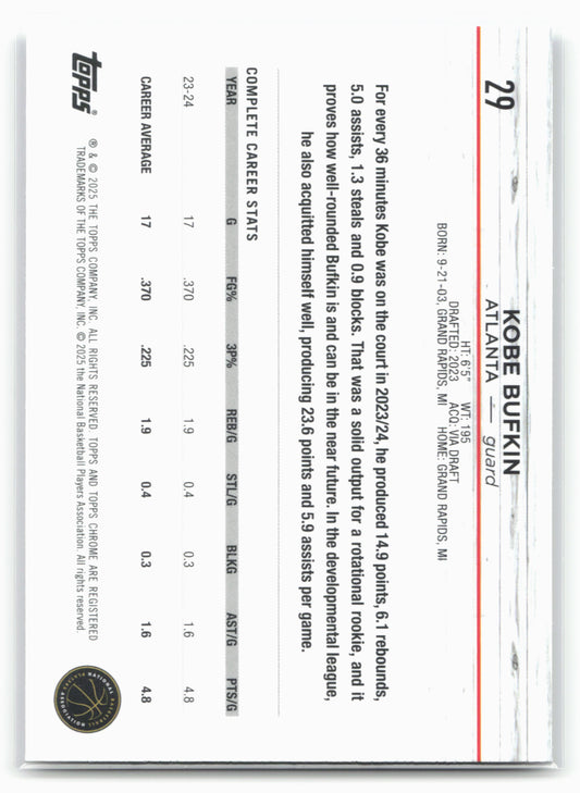 This is a nice example of a 2024-25 Topps Chrome #29 Kobe Bufkin Other important information about this card:In 2024 Kobe Bufkin played for the Atlanta Hawks.Please check out our...