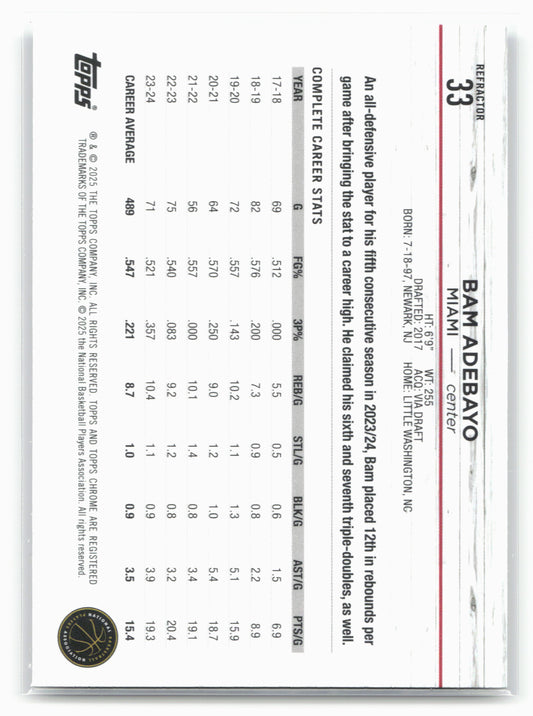 This is a nice example of a 2024-25 Topps Chrome #33 Bam Adebayo Refractor Other important information about this card:19201In 2024 Bam Adebayo played for the Miami Heat.Please check out...