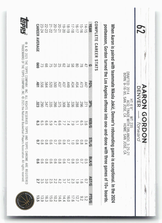 This is a nice example of a 2024-25 Topps Chrome #62 Aaron Gordon Other important information about this card:In 2024 Aaron Gordon played for the Denver Nuggets.Please check out our...