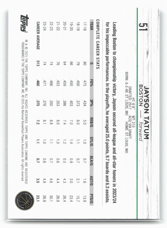 This is a nice example of a 2024-25 Topps Chrome #51 Jayson Tatum Other important information about this card:In 2024 Jayson Tatum played for the Boston Celtics.Please check out our...