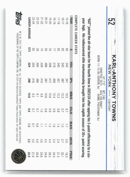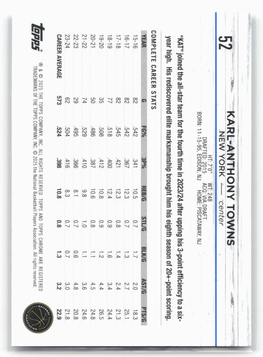 This is a nice example of a 2024-25 Topps Chrome #52 Karl-Anthony Towns Negative Refractor Other important information about this card:In 2024 Karl-Anthony Towns played for the New York Knicks.Please...