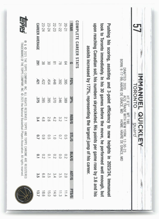 This is a nice example of a 2024-25 Topps Chrome #57 Immanuel Quickley Blue Basketball Refractor Other important information about this card:In 2024 Immanuel Quickley played for the Toronto Raptors.Please...