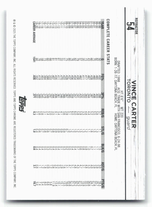 This is a nice example of a 2024-25 Topps Chrome #54 Vince Carter Refractor Other important information about this card:In 2024 Vince Carter played for the Toronto Raptors.Please check out...