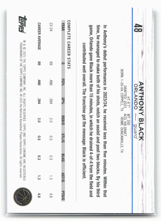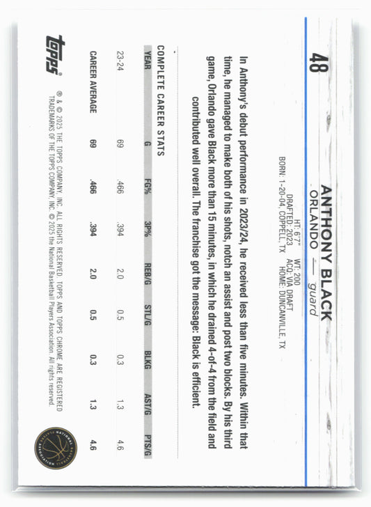 This is a nice example of a 2024-25 Topps Chrome #48 Anthony Black Blue Refractor Other important information about this card:19218SNIn 2024 Anthony Black played for the Orlando Magic.Please check...