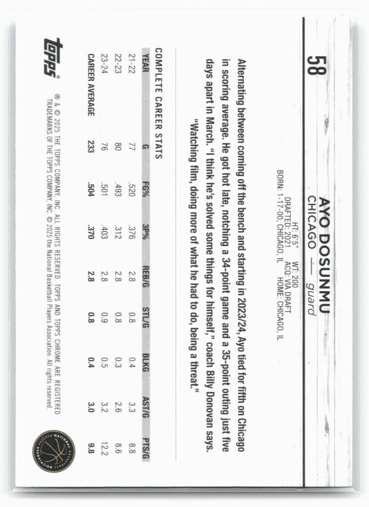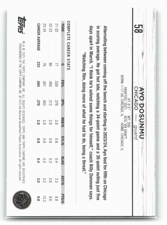 This is a nice example of a 2024-25 Topps Chrome #58 Ayo Dosunmu Topps Green Refractor Other important information about this card:In 2024 Ayo Dosunmu played for the Chicago Bulls.Please...
