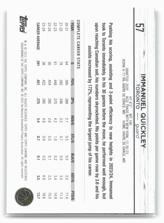 This is a nice example of a 2024-25 Topps Chrome #57 Immanuel Quickley Other important information about this card:In 2024 Immanuel Quickley played for the Toronto Raptors.Please check out our...