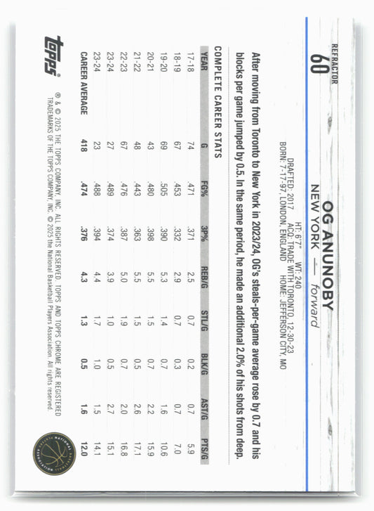 This is a nice example of a 2024-25 Topps Chrome #60 OG Anunoby Refractor Other important information about this card:18499In 2024 OG Anunoby played for the New York Knicks.Please check...