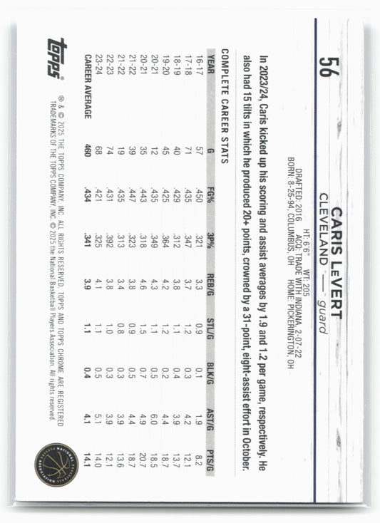 This is a nice example of a 2024-25 Topps Chrome #56 Caris LeVert Prism Refractor Other important information about this card:19210In 2024 Caris LeVert played for the Cleveland Cavaliers.Please check...