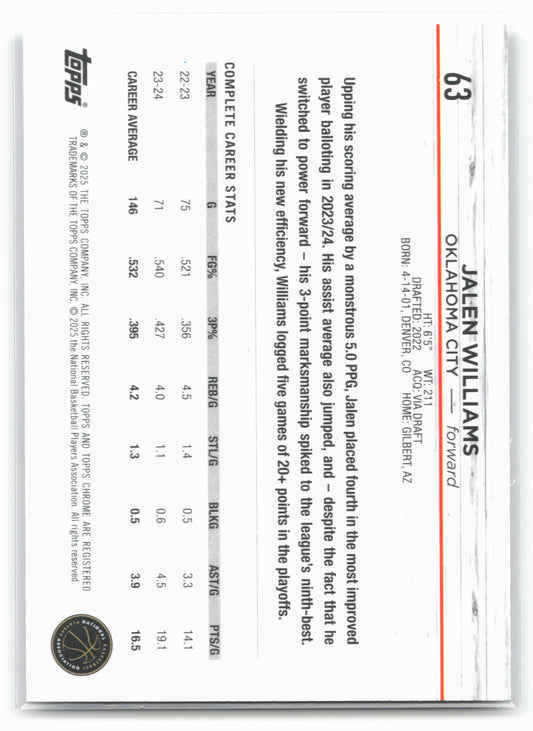 This is a nice example of a 2024-25 Topps Chrome #63 Jalen Williams Blue Basketball Refractor Other important information about this card:In 2024 Jalen Williams played for the Oklahoma City...