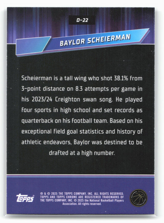 This is a nice example of a 2024-25 Topps Chrome #D-22 Baylor Scheierman Destiny Refractor Other important information about this card:In 2024 Baylor Scheierman played for the Boston Celtics.Please check...