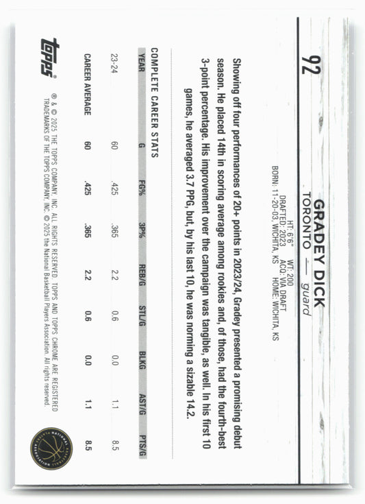 This is a nice example of a 2024-25 Topps Chrome #92 Gradey Dick Prism Refractor Other important information about this card:In 2024 Gradey Dick played for the Toronto Raptors.Please check...