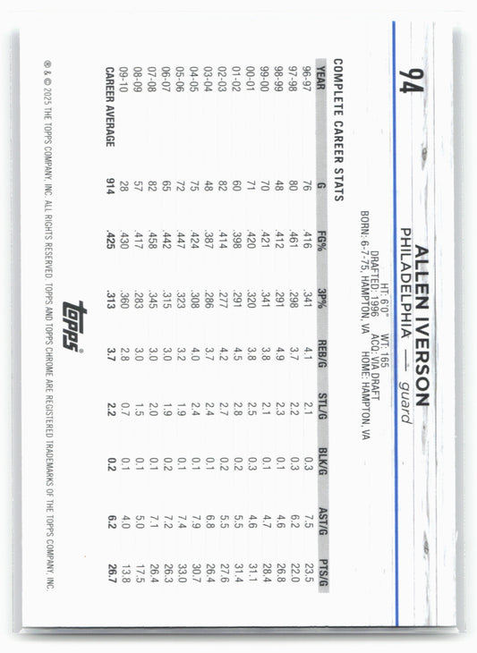This is a nice example of a 2024-25 Topps Chrome #94 Allen Iverson Refractor Other important information about this card:19262In 2024 Allen Iverson played for the Philadelphia 76ers.Please check out...