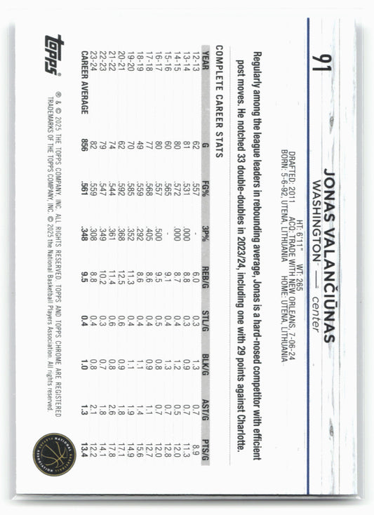 This is a nice example of a 2024-25 Topps Chrome #91 Jonas Valančiūnas Other important information about this card:In 2024 Jonas Valančiūnas played for the Washington Wizards.Please check out our...