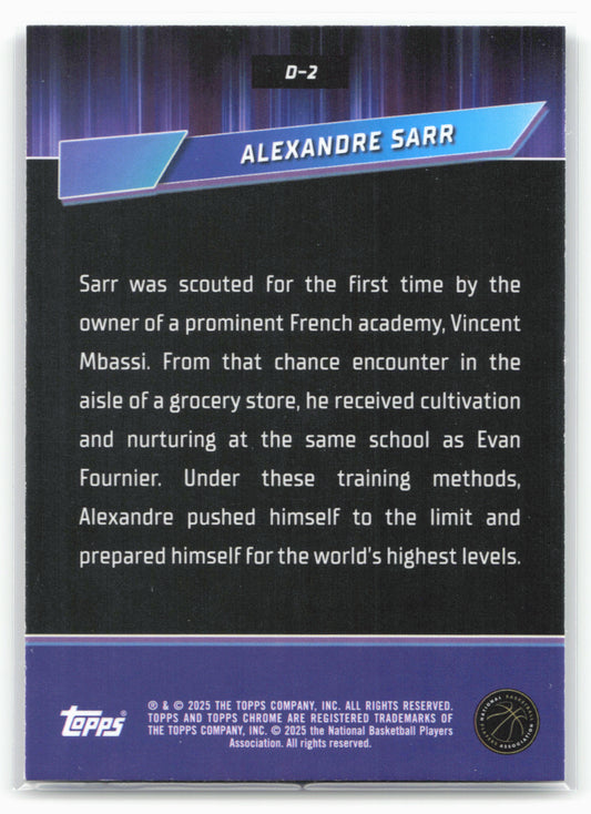 This is a nice example of a 2024-25 Topps Chrome #D-2 Alexandre Sarr Destiny Other important information about this card:In 2024 Alexandre Sarr played for the Washington Wizards.Please check out...