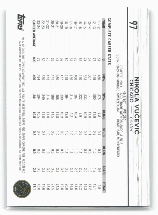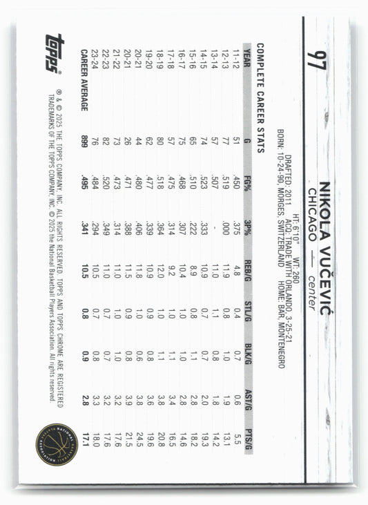 This is a nice example of a 2024-25 Topps Chrome #97 Nikola Vučević Other important information about this card:In 2024 Nikola Vučević played for the Chicago Bulls.Please check out our...