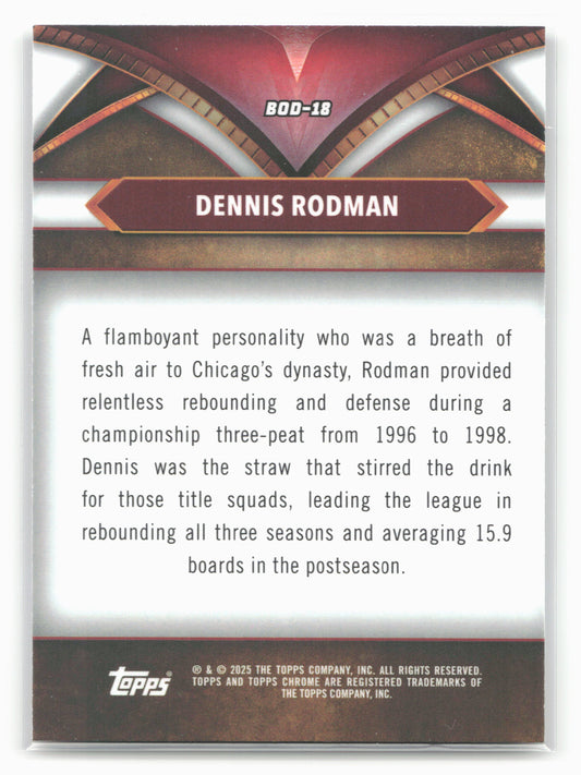 This is a nice example of a 2024-25 Topps Chrome #BOD-18 Dennis Rodman Ball of Duty Other important information about this card:In 2024 Dennis Rodman played for the Chicago Bulls.Please...