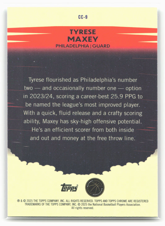 This is a nice example of a 2024-25 Topps Chrome #CC-9 Tyrese Maxey Countdown Complete Other important information about this card:In 2024 Tyrese Maxey played for the Philadelphia 76ers.Please check...