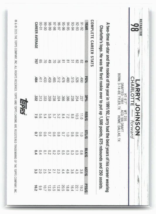 This is a nice example of a 2024-25 Topps Chrome #98 Larry Johnson Refractor Other important information about this card:19205In 2024 Larry Johnson played for the Charlotte Hornets.Please check out...