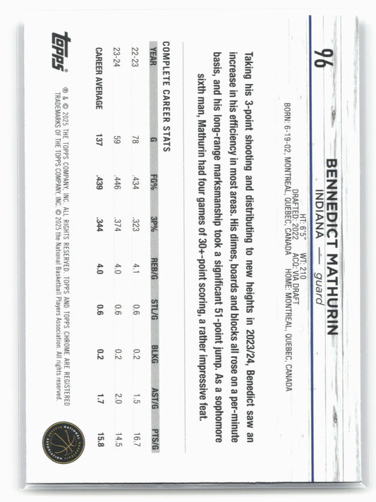 This is a nice example of a 2024-25 Topps Chrome #96 Bennedict Mathurin Purple Speckle Refractor Other important information about this card:19223SNIn 2024 Bennedict Mathurin played for the Indiana Pacers.Please...
