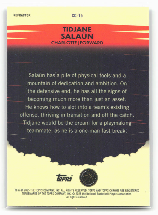 This is a nice example of a 2024-25 Topps Chrome #CC-15 Tidjane Salaün Countdown Complete Refractor Other important information about this card:19510In 2024 Tidjane Salaün played for the Charlotte Hornets.Please...