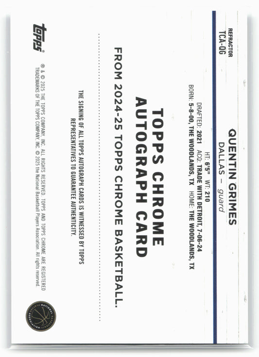 This is a nice example of a 2024-25 Topps Chrome #TCA-QG Quentin Grimes Topps Chrome Autographs Refractor Other important information about this card:AUIn 2024 Quentin Grimes played for the Dallas...
