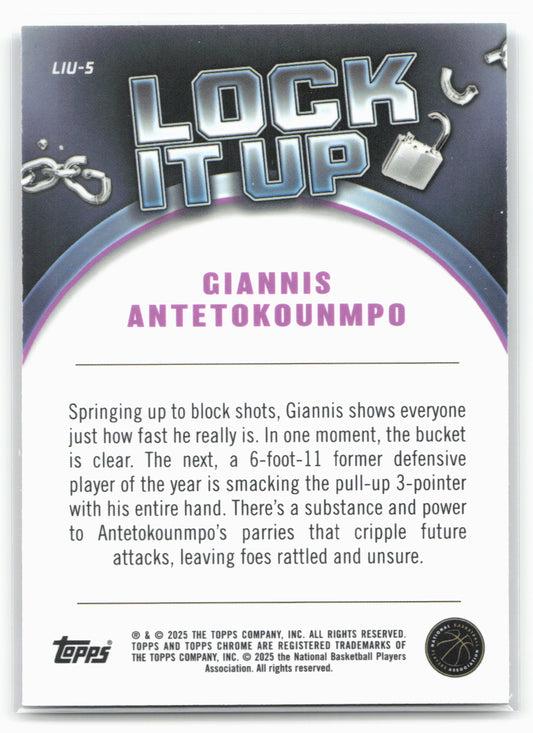 This is a nice example of a 2024-25 Topps Chrome #LIU-5 Giannis Antetokounmpo Lock It Up Other important information about this card:In 2024 Giannis Antetokounmpo played for the Milwaukee Bucks.Please...
