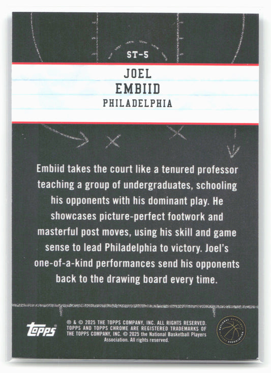 This is a nice example of a 2024-25 Topps Chrome #ST-5 Joel Embiid Show and Tell Blue Basketball Refractor Other important information about this card:In 2024 Joel Embiid played for...