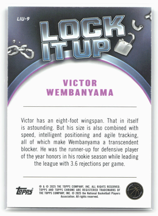 This is a nice example of a 2024-25 Topps Chrome #LIU-9 Victor Wembanyama Lock It Up Other important information about this card:19206In 2024 Victor Wembanyama played for the San Antonio...