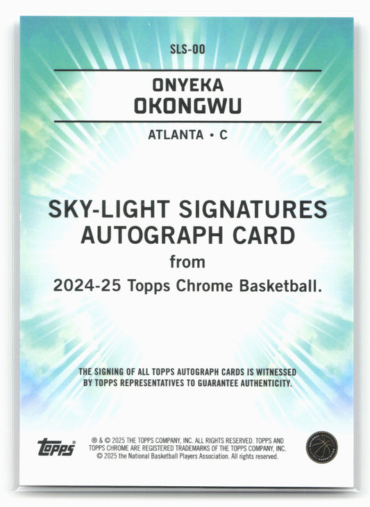 This is a nice example of a 2024-25 Topps Chrome #SLS-OO Onyeka Okongwu Sky-Light Signatures Other important information about this card:19221AUIn 2024 Onyeka Okongwu played for the Atlanta Hawks.Please check...