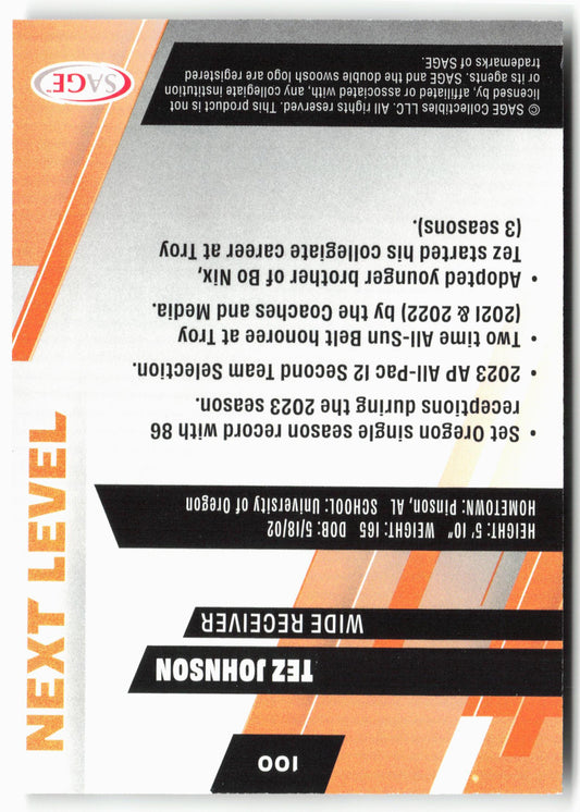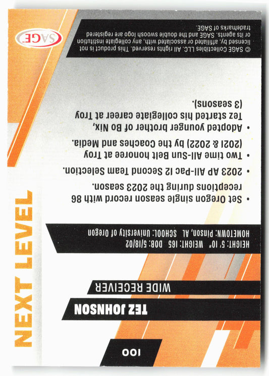 This is a nice example of a 2025 SAGE HIT Low Series #100 Tez Johnson Other important information about this card:In 2025 Tez Johnson played for the Oregon Ducks.Please check...