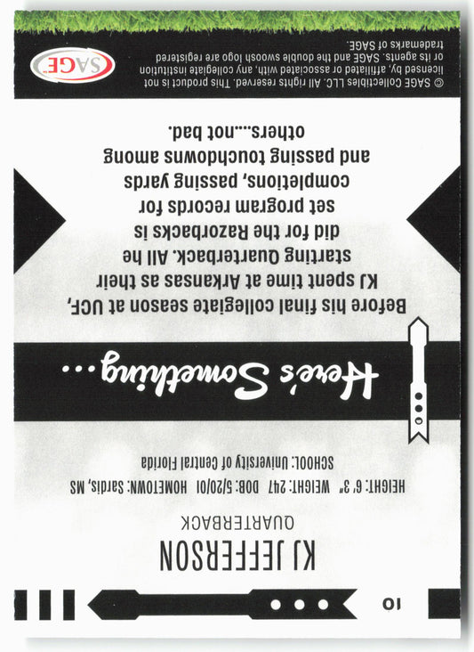 This is a nice example of a 2025 SAGE HIT Low Series #10 KJ Jefferson Other important information about this card:In 2025 KJ Jefferson played for the UCF Knights.Please check...