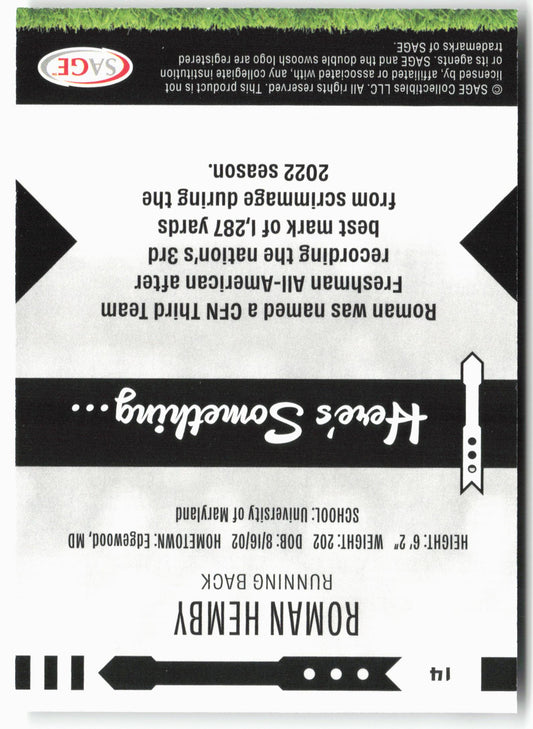 This is a nice example of a 2025 SAGE HIT Low Series #14 Roman Hemby Other important information about this card:In 2025 Roman Hemby played for the Maryland Terrapins.Please check...