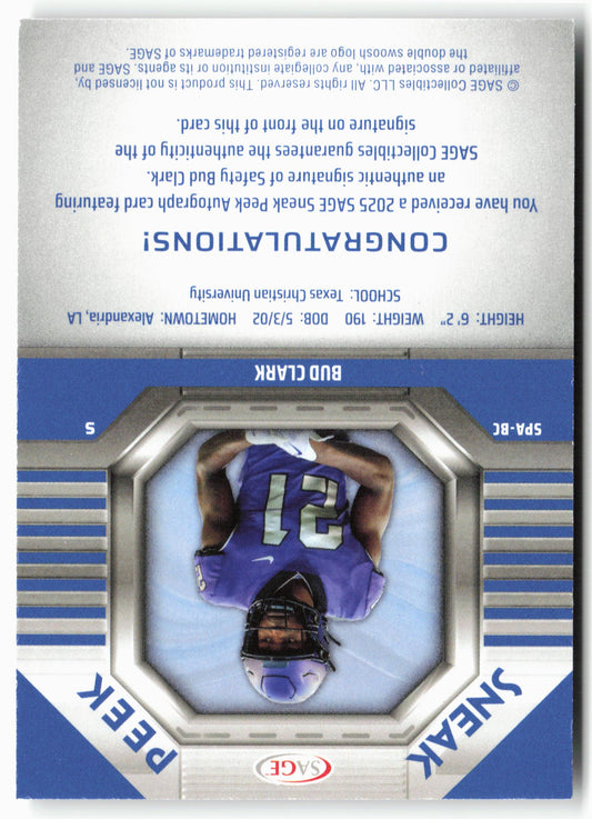 This is a nice example of a 2025 SAGE HIT Low Series #SPA-BC Bud Clark Sneak Peek Signatures Silver Other important information about this card:AUIn 2025 Bud Clark played for...