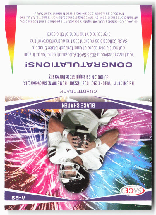 This is a nice example of a 2025 SAGE HIT Low Series #A-BS Blake Shapen Autographs Silver Other important information about this card:AUIn 2025 Blake Shapen played for the Mississippi...