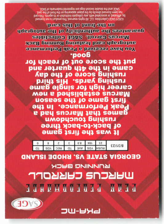 This is a nice example of a 2025 SAGE HIT Low Series #PK-MC Marcus Carroll Peak Performance Red Other important information about this card:In 2025 Marcus Carroll played for the...
