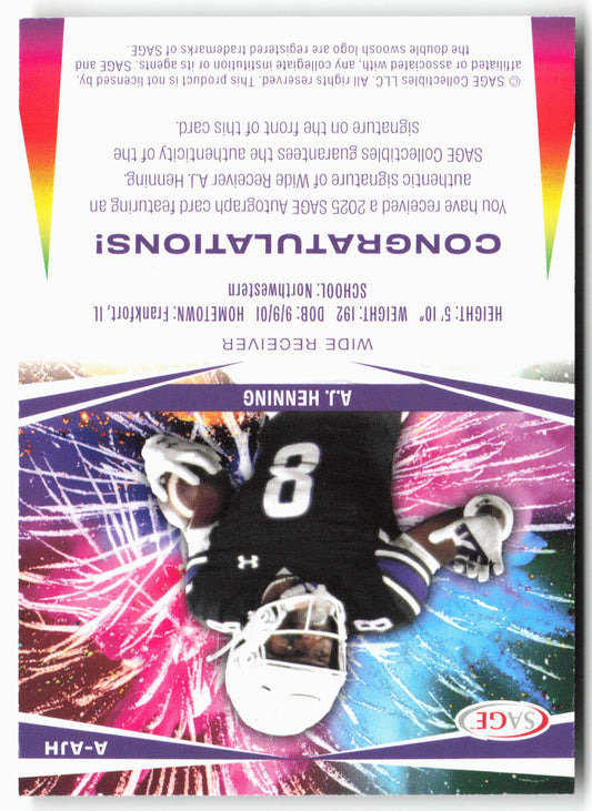 This is a nice example of a 2025 SAGE HIT Low Series #A-AJH A.J. Henning Autographs Gold Other important information about this card:SN,AUIn 2025 A.J. Henning played for the Northwestern...