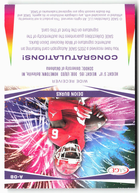 This is a nice example of a 2025 SAGE HIT Low Series #A-DB Deion Burks Autographs Gold Other important information about this card:SN,AUIn 2025 Deion Burks played for the Oklahoma...