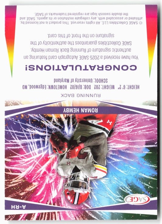 This is a nice example of a 2025 SAGE HIT Low Series #A-RH Roman Hemby Autographs Silver Other important information about this card:AUIn 2025 Roman Hemby played for the Maryland...
