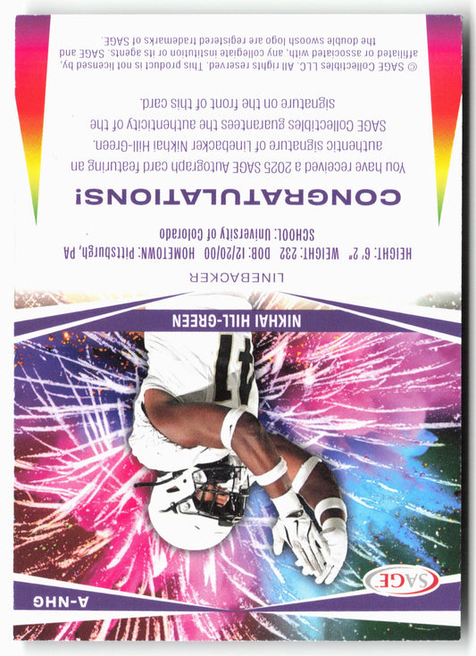 This is a nice example of a 2025 SAGE HIT Low Series #A-NHG Nikhai Hill-Green Autographs Silver Other important information about this card:AUIn 2025 Nikhai Hill-Green played for the Colorado...