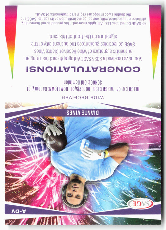 This is a nice example of a 2025 SAGE HIT Low Series #A-DV Diante Vines Autographs Silver Other important information about this card:AUIn 2025 Diante Vines played for the Old...
