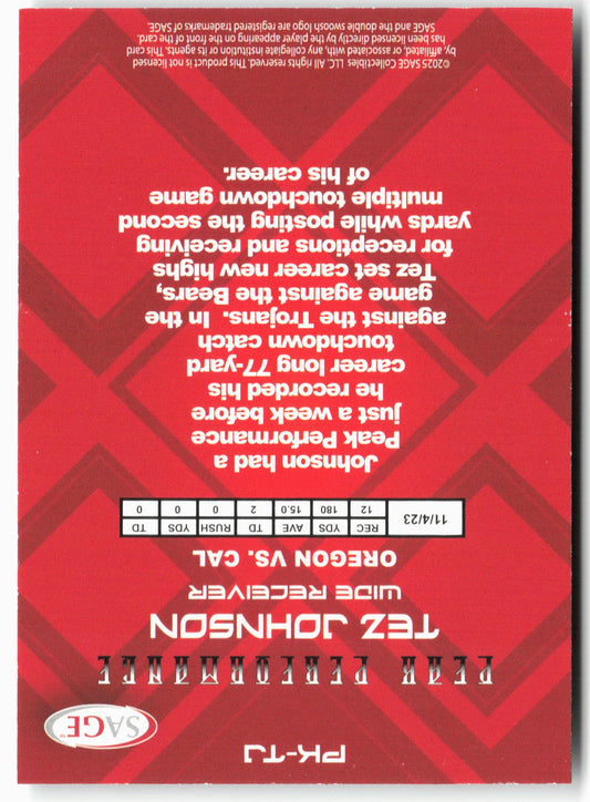 This is a nice example of a 2025 SAGE HIT Low Series #PK-TJ Tez Johnson Peak Performance Silver Other important information about this card:In 2025 Tez Johnson played for the...