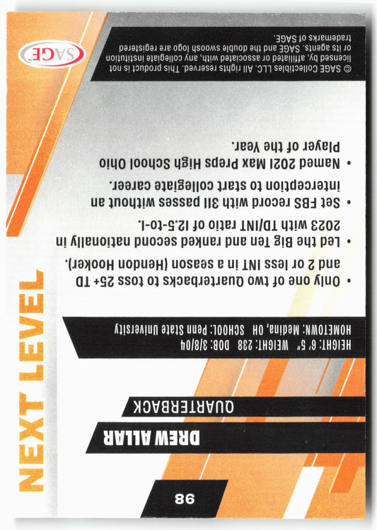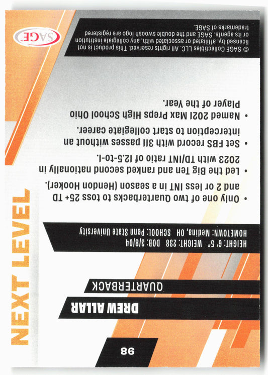 This is a nice example of a 2025 SAGE HIT Low Series #98 Drew Allar Other important information about this card:In 2025 Drew Allar played for the Penn State Nittany...