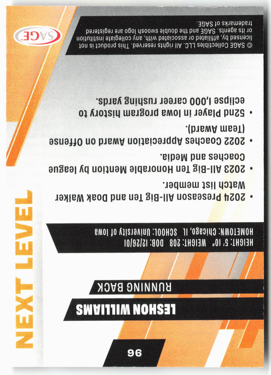 This is a nice example of a 2025 SAGE HIT Low Series #96 Leshon Williams Other important information about this card:In 2025 Leshon Williams played for the Iowa Hawkeyes.Please check...