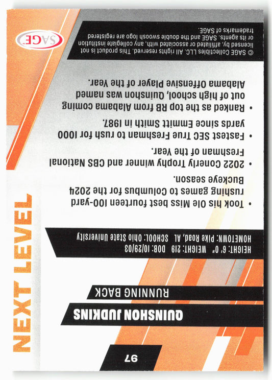 This is a nice example of a 2025 SAGE HIT Low Series #97 Quinshon Judkins Gold Other important information about this card:In 2025 Quinshon Judkins played for the Ohio State...