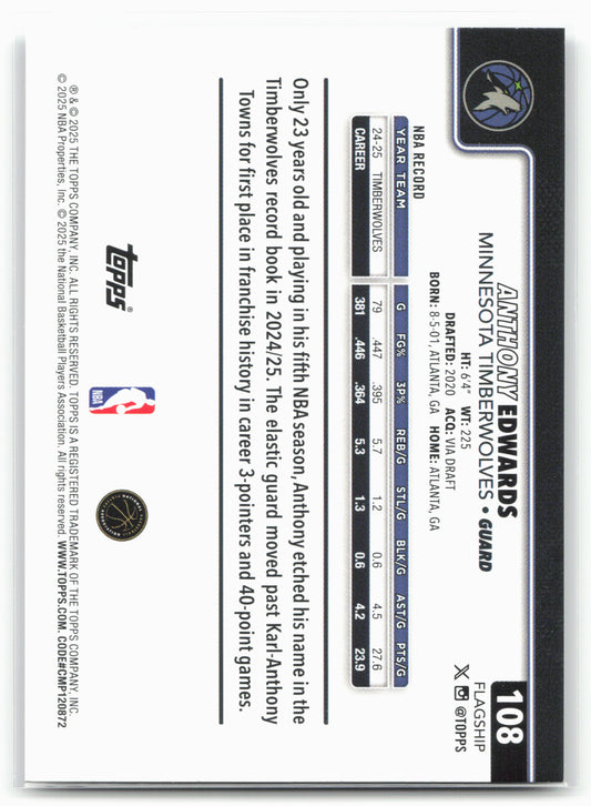 This is a nice example of a 2025-26 Topps #108 Anthony Edwards Other important information about this card:In 2025 Anthony Edwards played for the Minnesota Timberwolves.Please check out our other...