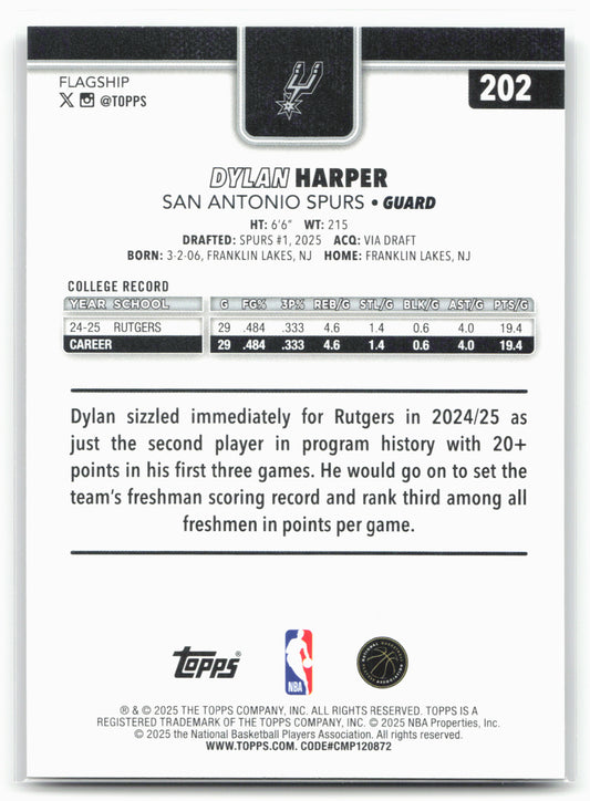 This is a nice example of a 2025-26 Topps #202 Dylan Harper Other important information about this card:RCIn 2025 Dylan Harper played for the San Antonio Spurs.Please check out our...