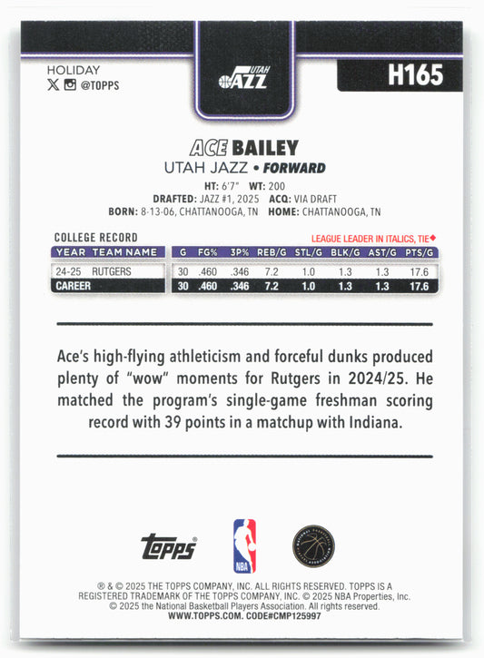 This is a nice example of a 2025-26 Topps Holiday #H165 Ace Bailey Other important information about this card:RCIn 2025 Ace Bailey played for the Utah Jazz.Please check out our...