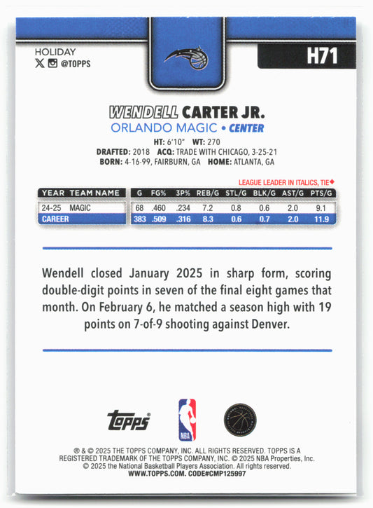 This is a nice example of a 2025-26 Topps Holiday #H71 Wendell Carter Jr. Other important information about this card:In 2025 Wendell Carter Jr. played for the Orlando Magic.Please check...